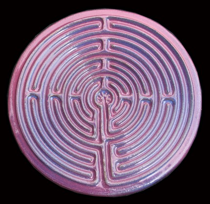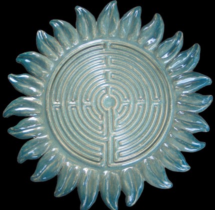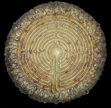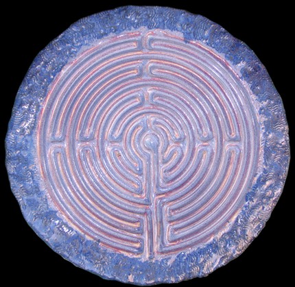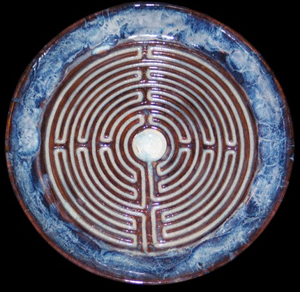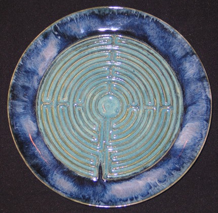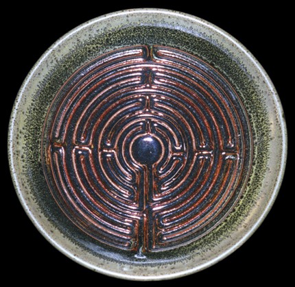 Labyrinths are a potent symbol in many cultures and have been for thousands of years, predating Christianity. In fact, the earliest positively dated labyrinth is from 1230 BC found in Greece. The precursor to the labyrinth is the spiral, linked to the circle. Ancient symbol of the goddess, the womb, fertility, feminine serpent force, continual change, and the evolution of the universe. Labyrinths are found in many cultures, from Crete and the Minator to Aztecs and Native Americans to turf labyrinths that still exist in England, Germany and Scandinavia. The patterns of the labyrinth are similar in design and conception to the mandalas of Buddhism, which are physical representations of the spiritual realm designed to aid in meditation. The walking labyrinths are similar in practice to the Japanese Zen practice of Kinhin, or “walking meditation.” Many oncologists are using labyrinths with their patients to help them focus on the healing aspects of positive thought. Labyrinths are not only gaining in popularity with the “New Age” crowd but many mainstream religious organizations are creating labyrinths as a path to deeper prayer and faith. My labyrinths serve the same basic meditative function of the larger walking labyrinths except with mine, like using the yellow pages, you let your fingers do the walking. I’ve created several sizes of labyrinths, from the really large version where the finger fits easily to smaller “fingertip” types. Most are flat, but I’ve created several in shallow bowl shapes. I even have a “travel labyrinth” size perfect to fit into a briefcase or travel bag, also doubles as a hot plate. Whether in spiritual or meditative use the labyrinth symbolizes the path to be followed, however long and complex, to reach the goal, the object of the quest, at the center. What that goal is, and how you use the labyrinth is up to you.