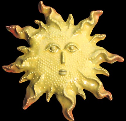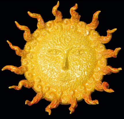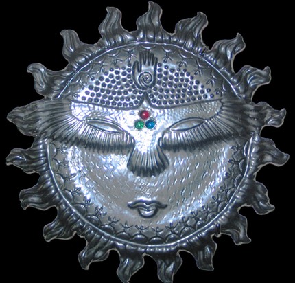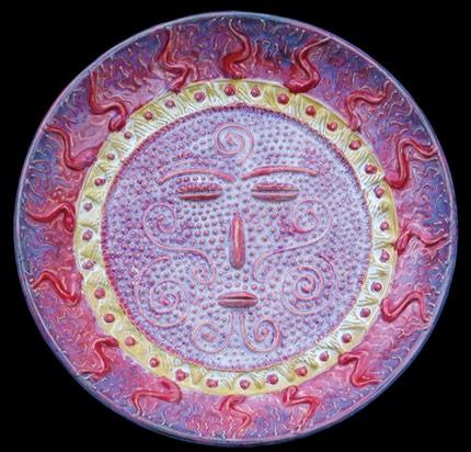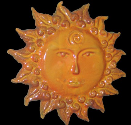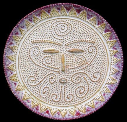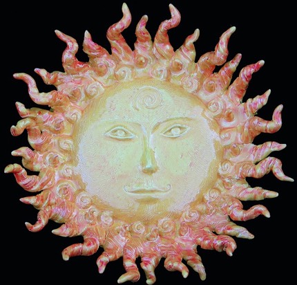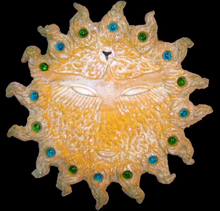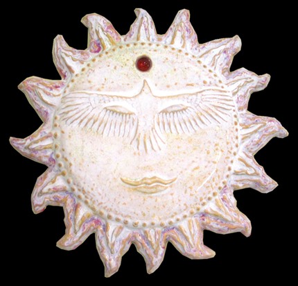 In keeping with all things spiritual and mythological I’ve explored creating my own versions of Sun Faces. I started with the traditional version and thought that I could use this for so much more. In many of these sun faces I’ve incorporated surface decorations for certain Sun Faces that illustrate a concept or thought. I’ve borrowed bits and pieces of imagery from from various sources and cultures, trying to make these images my own. I enjoy trying to create the symbol within a symbol, the Sun Face being a symbol of a major life giving deity in cultures and civilizations in history. I have then used the “face” of the sun as a canvas to work out other concepts, such as an eagle or hawk to symbolize freedom and/or inner far-sighted-ness. In a recent version, I’ve created the rays of the sun to be reminiscent of a lions mane, which also was an ancient symbol of the sun, symbolizing strength or power, and was identified with sun worship and the power of both gods and goddesses.